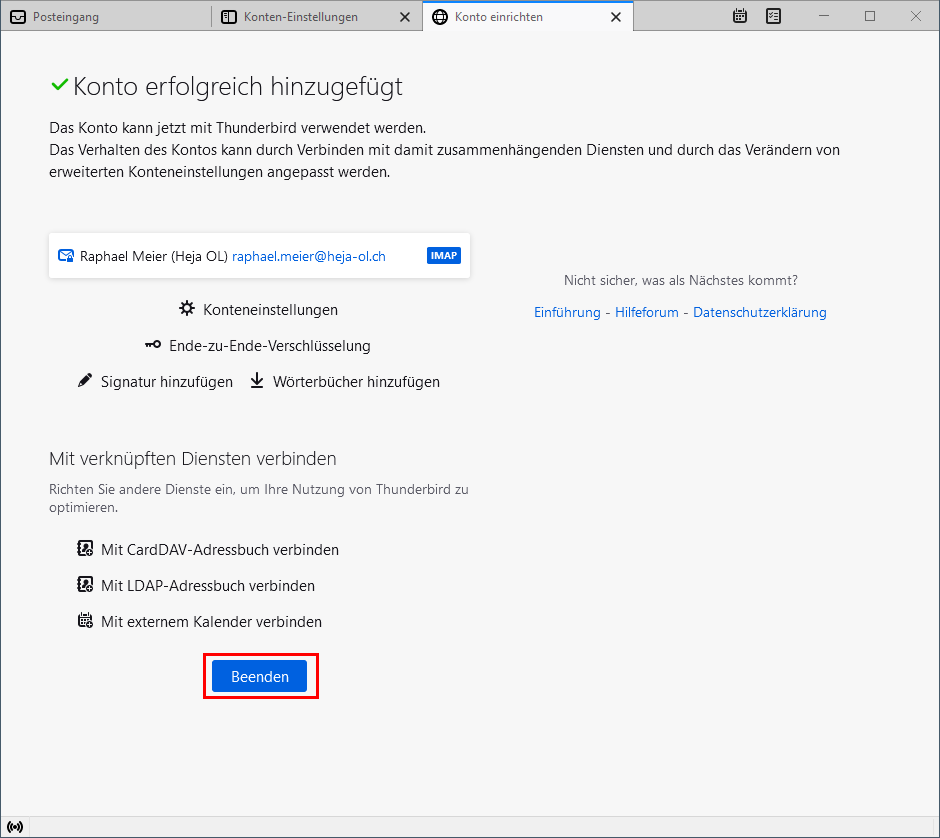 Quelltext anzeigenÄltere VersionenLinks hierherCopy this pageNach oben Letzte ÄnderungenSend via e-MailPrintPermalink × Inhaltsverzeichnis Mail einrichten Thunderbird ist noch nicht konfiguriert Thunderbird hat schon andere Mailsaddressen Mail einrichten Thunderbird ist noch nicht konfiguriert Thunderbird hat schon andere Mailsaddressen heja-ol/mail.txt Zuletzt geändert: 2021/12/01 10:57von pme
