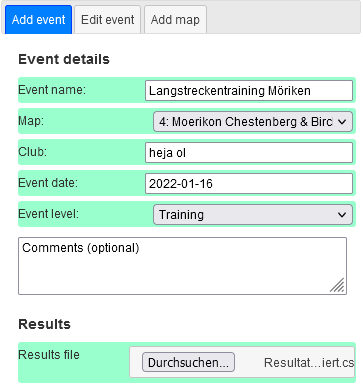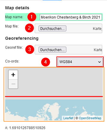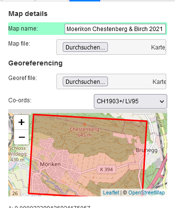 Quelltext anzeigenÄltere VersionenLinks hierherCopy this pageNach oben Letzte ÄnderungenSend via e-MailPrintPermalink × Inhaltsverzeichnis RG2 Anlass erstellen Im Adminbereich anmelden Neue Karte erfassen Event erstellen RG2 Anlass erstellen Im Adminbereich anmelden Neue Karte erfassen Kartenname vergeben Kartenbild hochladen JGW Datei Koordinatensystem auswählen und mit Kartenvorschau ⇒ Mit dem Buttom „Add Map“ die Karte hinzufügen ⇒ ID Nummer merken Event erstellen ol/routegadget2/new_event.txt Zuletzt geändert: 2022/02/10 21:19von pme